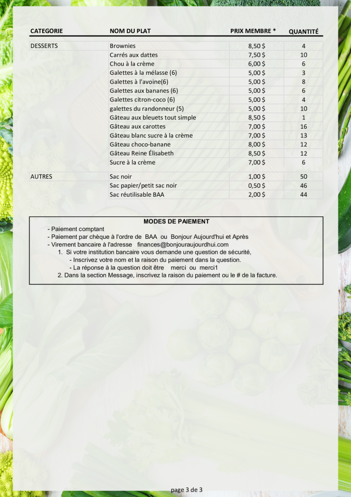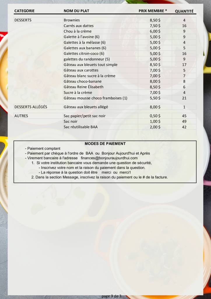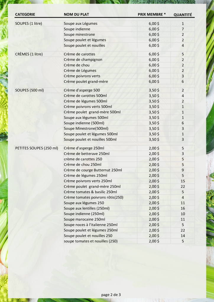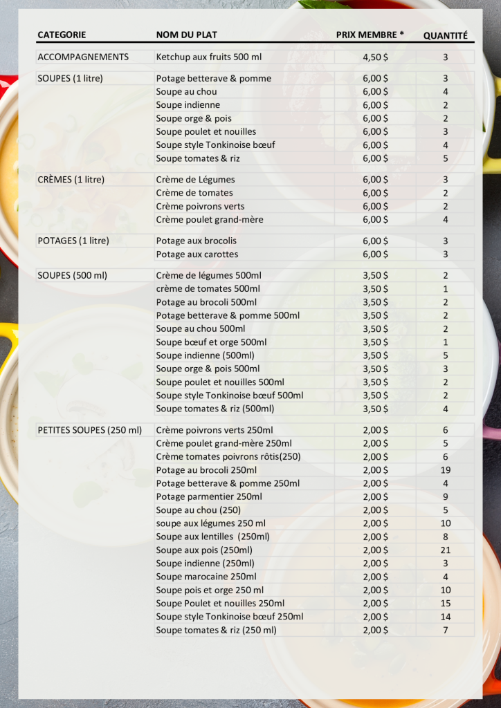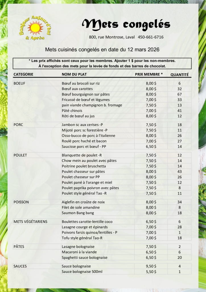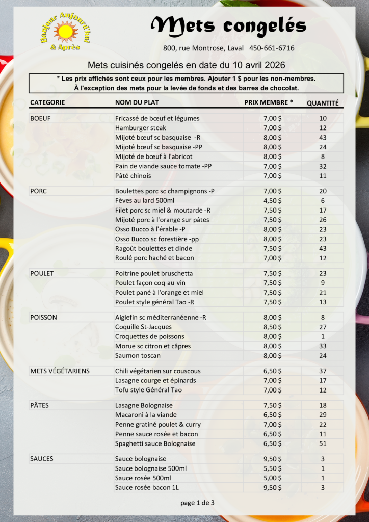 Listes des plats congelés Prix compétitifsFormats variésAchetez un 5e repas économisez 1.00$ Devenez membre; adhésion annuelle de 28$/an