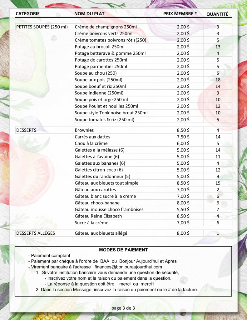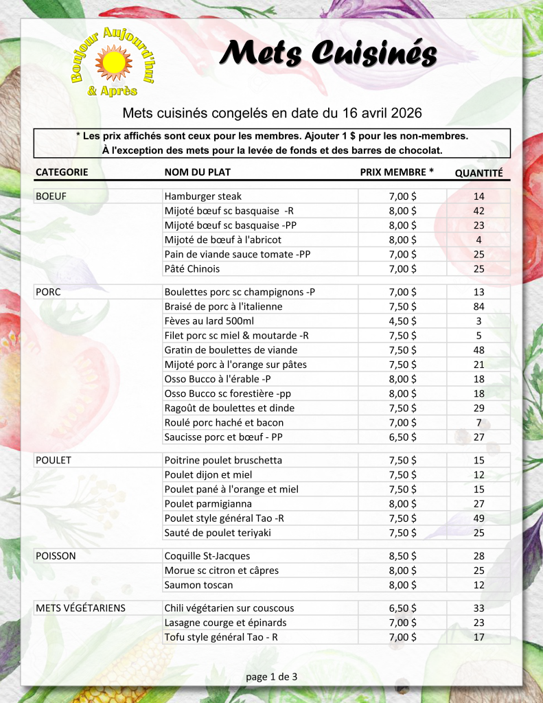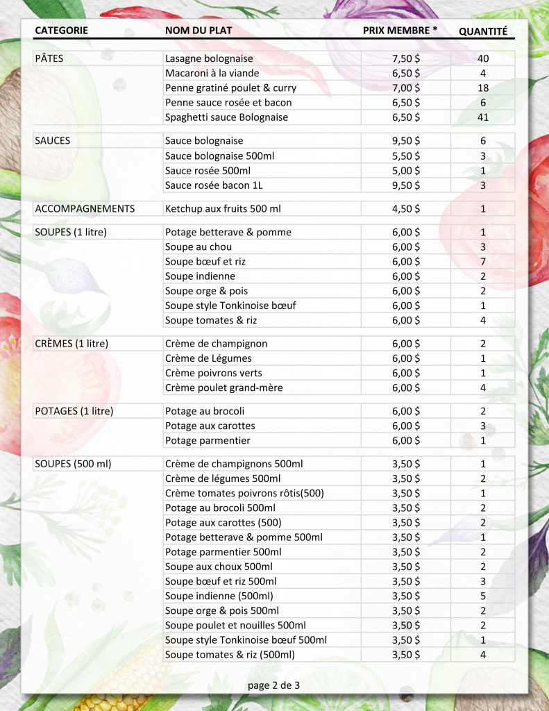 Listes des plats congelés Prix compétitifsFormats variésAchetez un 5e repas économisez 1.00$ Devenez membre; adhésion annuelle de 30$/an